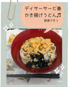 かき揚げうどん♬でぬくぬくに コメントを残す 本日のデイサービス奏の昼食です かき揚げうどん♫ 白菜の生姜和え ココアムース 今日も鶴岡は雪雪雪 温かいうどんで身心ぬくぬくです。 かき揚げでエネルギーアップ 沢山のワカメでミネラルいっぱいです。 今日は聡子先生のオンライン研修会です お口のオーラルフレイル防止へ日々実践していきましょう!