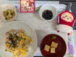 蟹ちらし寿司・木野俣原木椎茸異例すまし汁・白菜のお浸し・黒豆煮・プチクリスマスケーキ♪