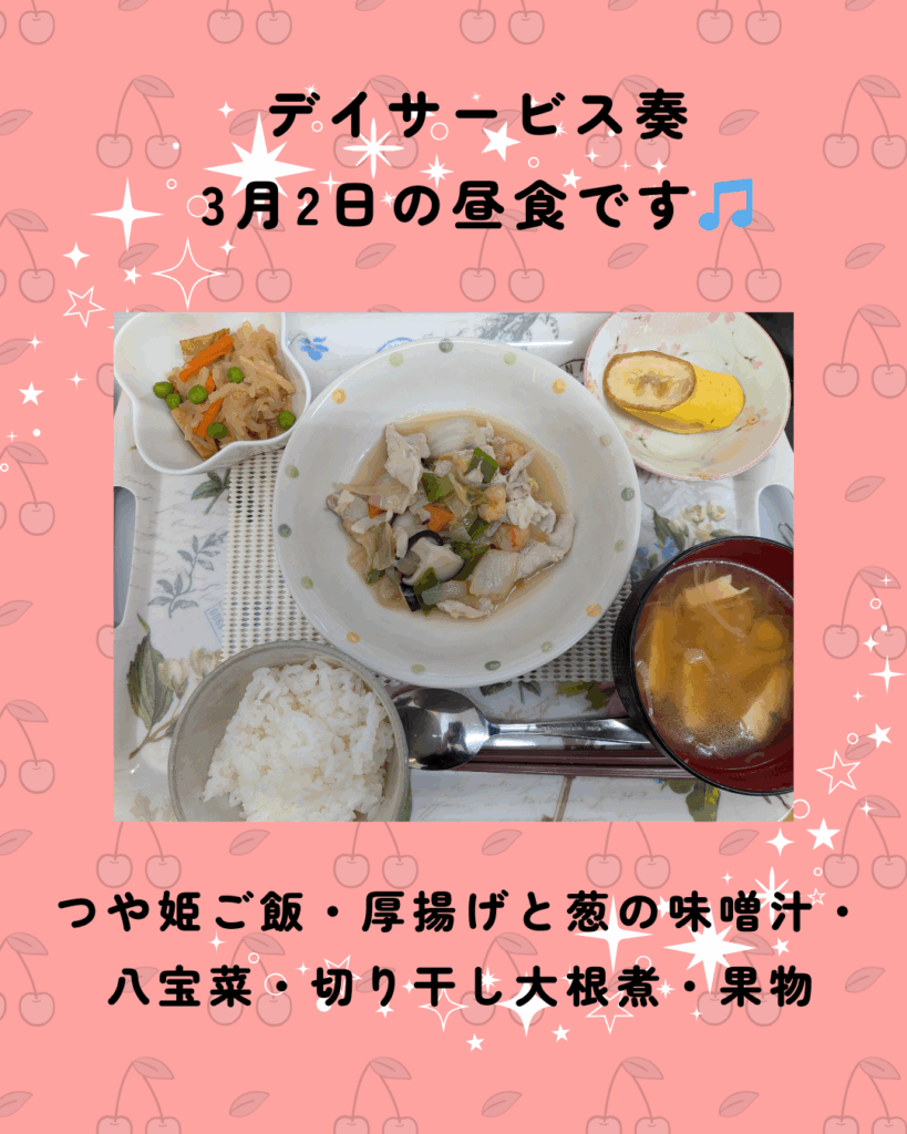 つや姫ご飯、厚揚げと長葱の味噌汁、八宝菜、切り干し大根煮、果物